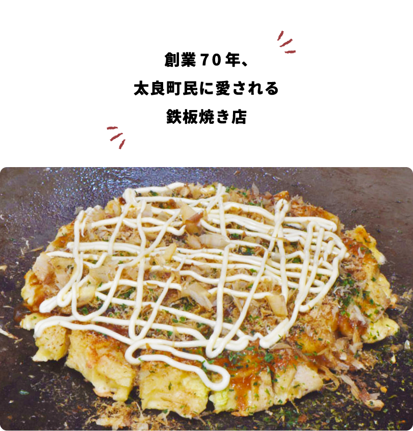 昭和26年に伯母が始めたのが最初ですので創業70年になります。創業当初は「お好み焼き」がまだ認知度が低くて苦労したようですが、地元の学校の先生や保護者の皆さんの集まりに利用して頂くようになっていったようです。昭和48年までは近くに流れる嫁川の上に客部屋があるような、風情あるお店でした。伯母は90を過ぎてもお店を切り盛りしていて、新聞の取材なども受けて話題にして頂きました。伯母は独身で後継者がいなかったので、私が2代目として47歳の頃から店に入り、一緒に働き始めました。伯母が2009年に他界してからは1人で切り盛りしています。本当に忙しい時は奥さんも手伝ってくれます。私自身は店を継ぐ前は営業の仕事をしていました。もちろん当時は継ぐなんて考えてもいませんでした。ただその頃少し仕事や人間関係に疲れていた事もあり、やってみようと考えるようになっていきました。今考えれば全く畑違いの仕事からこの世界に入ったので、スムーズにこの仕事をやれたのかもしれませんね。まっさらな状態で入りましたから。もし私が同じような飲食の仕事をしていたなら、ああしたい、こうしたいとか色々余計なことを考えたかもしれません。今は本当にやって良かったなと思っています。おかげさまで今も多くの地元の方に利用して頂いています。