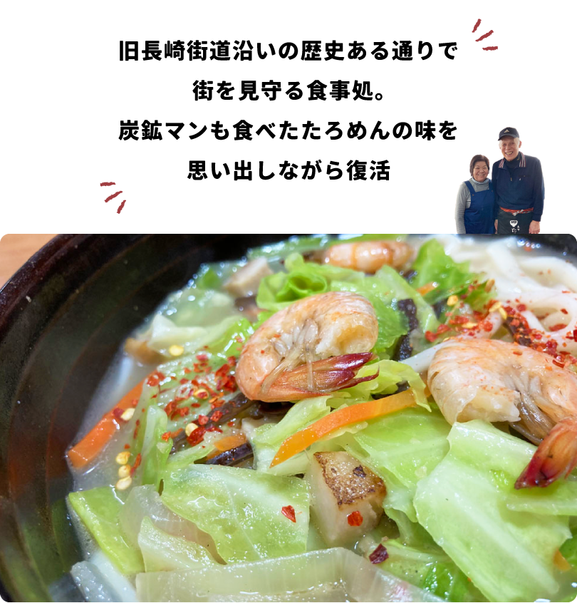 もともと旅館を営んでいた祖父が食事処を始め、父から兄、私と代々受け継いできた食事処です。現在の店舗は約40年前に建てられました。子どもの頃から家業の手伝いをしていた私は、学校卒業後も家族と一緒に働き、私が店主になってからは夫がサラリーマンを辞め、手伝ってくれています。屋号は祖父の代の「三勇士」から父が「山遊志」、そして兄が「さんゆうし」と読みはそのままに変更。戦時中に称えられた九州出身の三人の勇士のうち、一人が大町町にゆかりある方だったことで名付けられたようです。