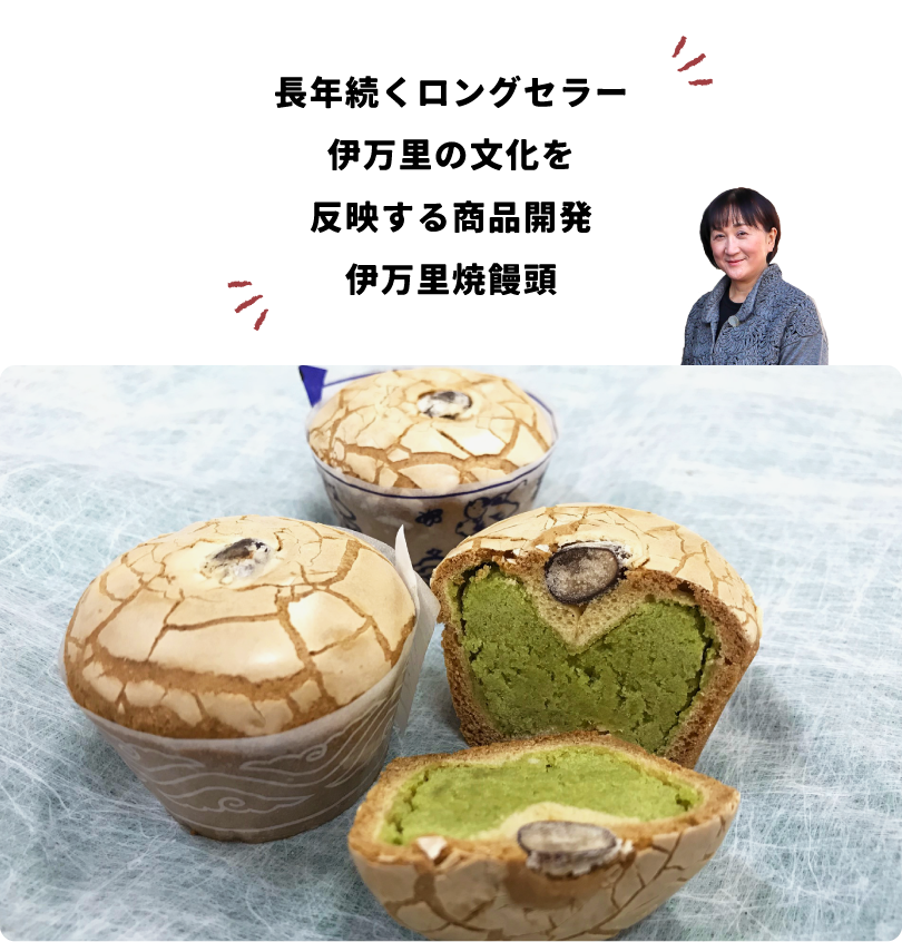 当店では伊万里の歴史や文化を反映した商品の開発に力をいれています。中でも「伊万里焼饅頭」がロングセラーの人気商品です。陶磁器を鑑賞する上での見どころの一つである釉薬の表面にできるひび割れ(貫入)を饅頭の上面に表現しております。